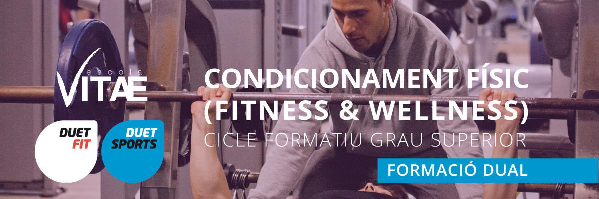 T’agrada el fitness? Vols estudiar i treballar? Et presentem el Cicle Formatiu de Grau Superior en Condicionament Físic en modalitat dual (opcional). Escola Vitae i Duet hem arribat a un acord de col·laboració per oferir aquest estudi de formació professional dual per als nostres estudiants, una gran oportunitat per apropar l’estudiant