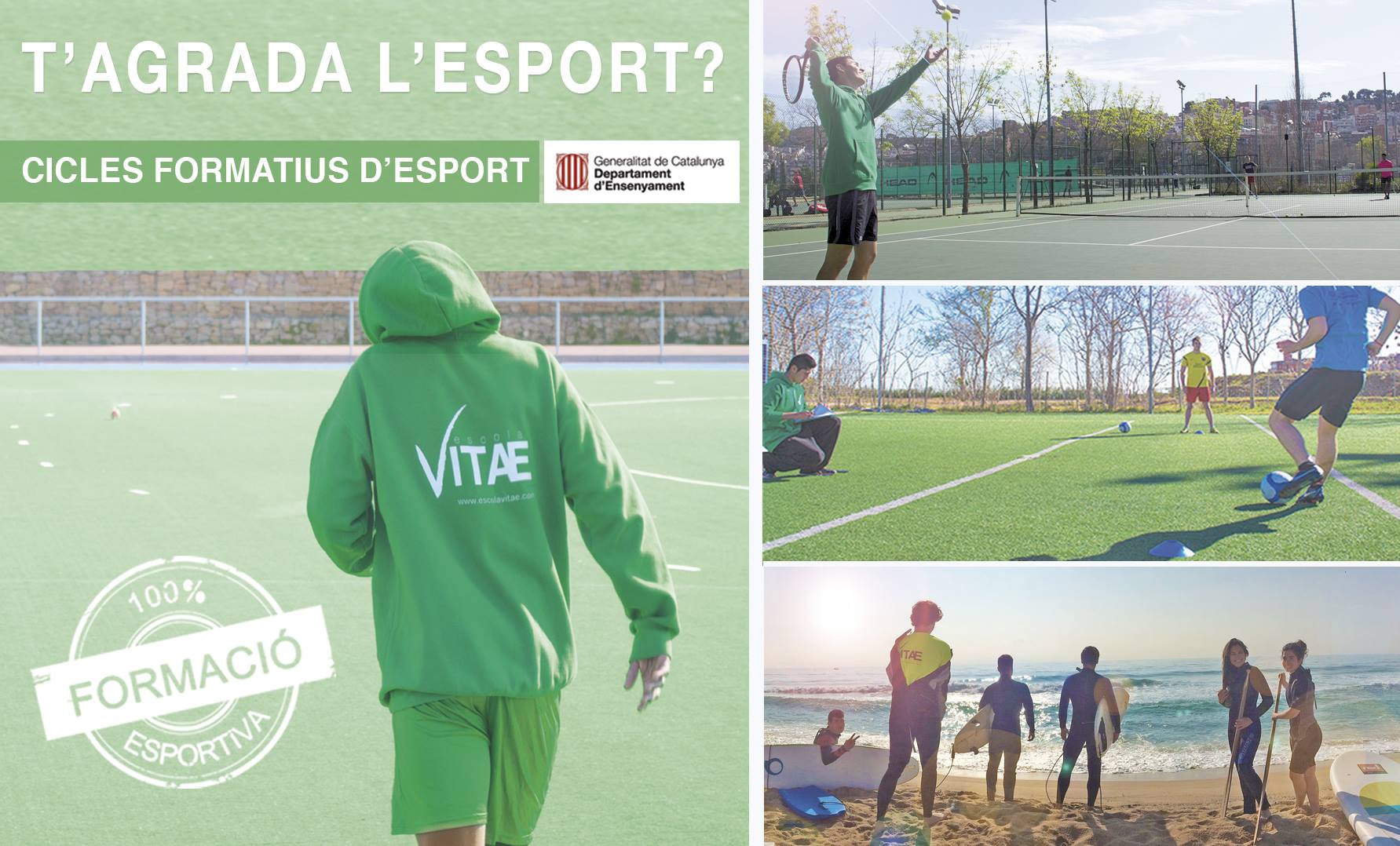 T’agrada l’esport i vols dedicar-te professionalment? Escola Vitae t’ofereix un ventall de Cicles Formatius d’Esport Ja està obert el procés de matriculació per al proper curs 2019-2020. Amb una oferta formativa 100% esportiva, oferim cicles formatius d’esport de: grau superior, grau mitjà, i estudis de tècnics esportius. Escola Vitae s’ha